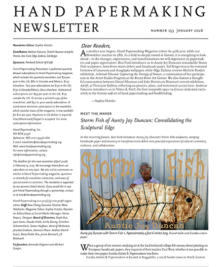 In many cases, Japanese papers are the result of the determined development of a specific combination of technique, materials, and tools—all impacted by local conditions—in order to make a product that is uniquely suited to a particular use. For as long as I have been studying washi in Japan, I have endeavored to visit studios located throughout the country. I am grateful to have witnessed firsthand some of the different techniques that are employed from region to region. After five years, and about thirty studios, I feel as if I have only just begun my research. Perhaps with any craft, the spectrum of tools and techniques broadens with investigation, but the closer I look at Japanese papermaking, the richer, more interesting, and infinite the possibilities seem to be. In this brief article, I would like to share some of my findings about the diversity of production methods.1 My hope is to enable readers of Hand Papermaking to make better, well-informed decisions when obtaining and using Japanese papers, and to help hand papermakers identify appropriate production methods when preparing Japanese-style papers for specific uses. In this article I have divided the Japanese papermaking process into eight main steps, and focused on methods used for paper made entirely or chiefly from kozo fiber.2 Kozo paper represents about 80% of handmade washi. By utilizing the other two main plants, mitsumata and gampi, or other fibers occasionally used in Japan, even further variation is possible in the finished paper. Observing Variations in Japanese Papermaking Traditions, Tools, and Techniques paul denhoed summer 2007 - 15 Two-page spread showing the beating step in the papermaking process, from Kamisuki Chohoki \[A Handy Guide to Papermaking\], originally published in 1798. All photos by and courtesy of the author unless otherwise noted. Living National Treasure papermaker Iwano Ichibei making Hosho paper in Echizen, Fukui prefecture. 2006. Photo by and courtesy of Mina Takahashi. 1. Selecting the Fiber As we are limiting our discussion to kozo paper, fiber selection would seem straightforward. However, there are at least four botanical varieties of kozo.3 And within each type, there can be wide variation in fiber characteristics depending on the location, climate, and growing conditions. Many papermakers suggest that they are able to make their paper only as a direct result of cultivating their own kozo crop, bringing forth the unique characteristics of their locally grown kozo. Others describe the difficulty of continuing to make their paper, as the quality of the fiber they are receiving from suppliers continues to deteriorate or change. One papermaker who was forced to switch to a new supplier in a different region a few years ago, concedes that the paper he makes now is subtly different from what has been made in his family's studio for generations. Changes in fiber stock invisible to the naked eye will become apparent when the paper is put to use. With this in mind, fiber blends have been developed to make paper that is softer, or more porous, or denser, or perhaps simply less expensive. Although originally a 100% gampi paper, Torinoko (a popular paper for Japanese-style painting) is now available in a variety of blends (e.g., 100% gampi, a mixture of mitsumata and gampi, or 100% mitsumata).4 These differences in percentages may seem trifling, but Living National Treasure papermaker Iwano Ichibei once told me that a well-known Japanese printmaker had continually asked him to offer a version of his world-renowned Hosho paper by adding as little as 5% wood pulp, to fill in the spaces between the kozo fibers and make the paper more "printable." Iwano refused; he makes only papers of 100% kozo. 2. Scraping After the kozo shoots are harvested, and the bark is stripped from the woody pith, its black outer layer is usually scraped off. The middle green layer is often removed too, but sometimes left intact. There are varieties of paper (such as Sekishubanshi) that are well-known for qualities attributed to the inclusion of the green layer. This practice leads to a crisper, more yellow sheet, said to be insect resistant. In one studio I visited, they endeavor to remove only the top half of this thin green layer, leaving behind only the softer, more yellow portion. For some papers, it is necessary to remove every trace of discolored, hardened, or otherwise imperfect fiber during the scraping process. When preparing fiber for Udagami, papermakers in Yoshino trim 1 to 5 cm from both ends of the bark strips (where discoloration tends to occur). If left in, these dark fibers would add an overall shade to the finished sheets. The trimmings are collected, and used later to make a different, inferior grade of paper. After the scraping process, the bark may be whitened naturally by exposing it to sun, snow, or cold. 3. Cooking The most common agent today for cooking fiber in Japan is soda ash.5 It is a snap to use and relatively gentle on the fiber. But it is not the only choice, and the selection of alkali has a great effect on the finished paper.6 Caustic soda is a potent chemical that will remove the outer black layer during cooking. While it allows the papermaker to skip the tedious and time-consuming step of scraping, it can damage the cellulose. Both caustic soda and soda ash tend to leave behind traces of sodium, considered detrimental to the strength and longevity of the paper. Cooking with lye of wood ash is the traditional method, and tends to be gentle on 16 - hand papermaking Worker in the kozo field at harvest time, Oguni village. Courtesy of Imai Hiroaki. Detail of the green layer being removed from kozo bark, Oguni Washi Papermaking Studio. Courtesy of Imai Hiroaki. Fukunishi Hiroyuki rinsing kozo in the Yoshino river in preparation for kawazarashi (river-bleaching), a process which whitens the fiber by exposing it to the sun and the rinsing power of the river. 2006. Photo by and courtesy of Mi